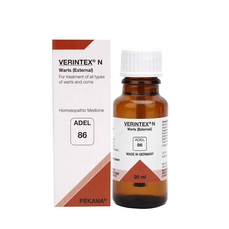ADEL 86 Verintex N External Drop is a homeopathic preparation traditionally associated with supporting the skin in cases of warts and other skin troubles. It is referenced in homeopathy for its role in juvenile acne, skin outgrowths, and chronic conditions. With antiseptic and disinfectant properties, this formula is considered supportive in maintaining healthy skin and addressing recurring imbalances.