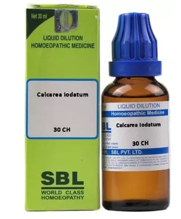 - Calcarea iodata is a well indicated remedy in thyroid enlargements about time of puberty. Flabby children who are subject to colds are commonly the affected ones. Calcarea iodata has the secretions inclined to be profuse and yellow. Conditions like adenoids, croup have shown good results by calcarea iodata.