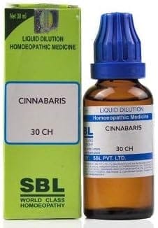 - Cinnabaris is useful in red papulous eruption, without itching, on both elbows.