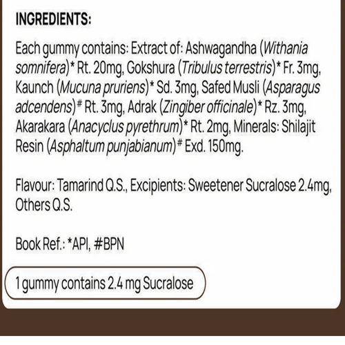 The gummies contain a blend of Shilajit and traditional Ayurvedic herbs: