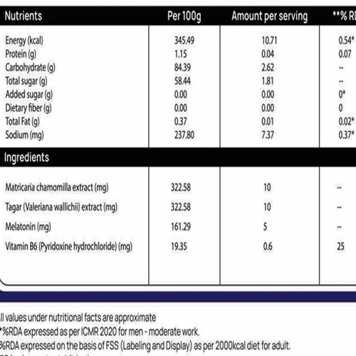 Matricaria Chamomilla (10mg): German chamomile extract has been traditionally used for centuries to promote relaxation and reduce anxiety. It is referenced for improving sleep quality.